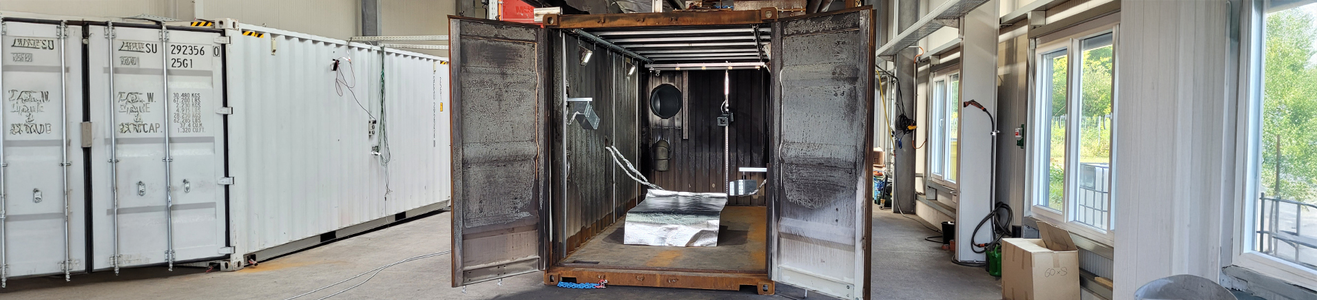 Hierfür stehen in unserem Testzentrum zwei individuell modifizierte Testkammern mit den Abmessungen 5.000 x 2.000 x 2.000 mm zur Verfügung, die mit diversen Sicherheits- und Löscheinrichtungen ausgestattet sind. So können nicht nur Brandtests mit Temperaturen von über 1.000 °C problemlos kontrolliert und sicher durchgeführt werden, sondern auch Versuche, bei denen es zur Explosion kommen kann.